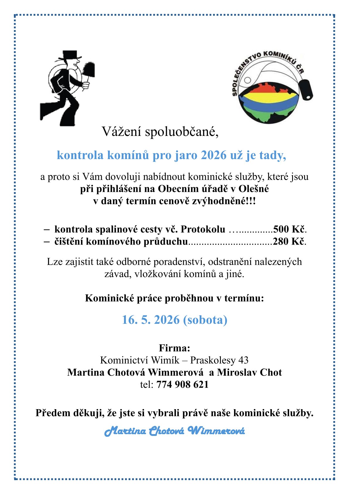Kominické služby Kominictví Wimík Praskolesy v Olešné 16.5.2026
