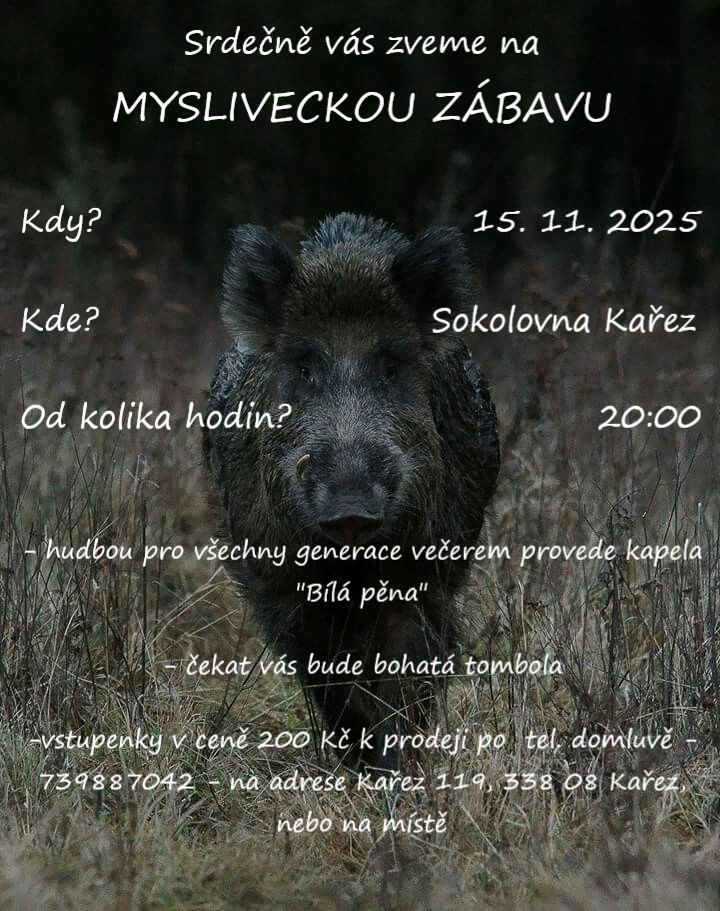 Pozvánka do Kařeza na Mysliveckou zábavu 15.11.2025