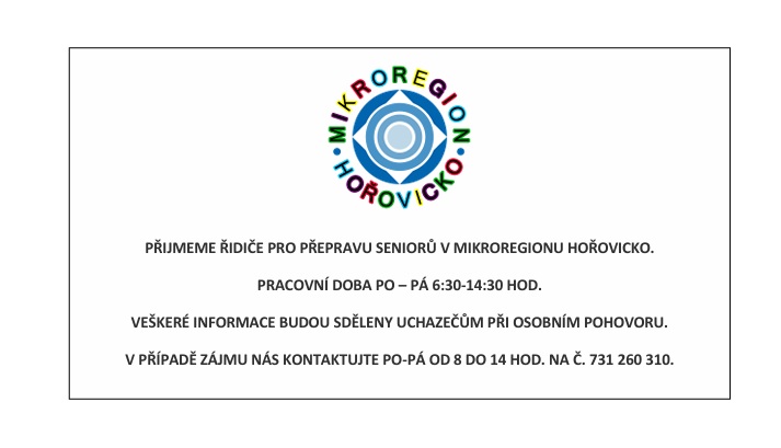 Mikroregion Hořovice poptává řidiče pro přepravu seniorů v rámci projektu Taxík Maxík. Více informací a kontakt naleznete zde.