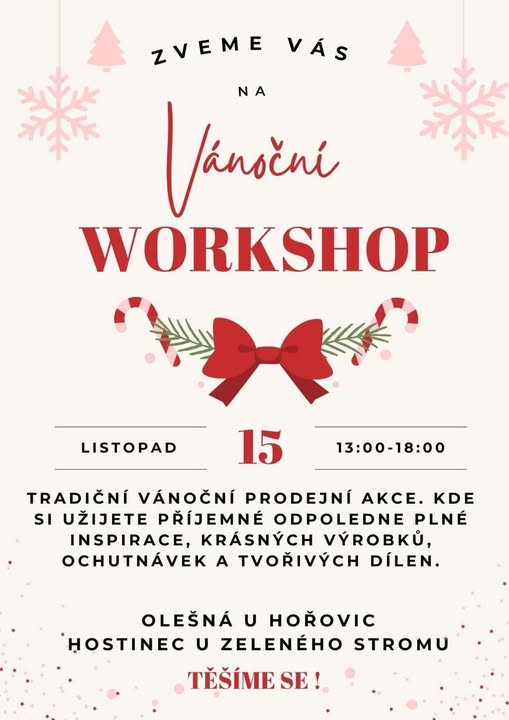 Bližší informace k tradičnímu Vánočnímu workshopu v Olešné, který proběhne v sobotu 15. listopadu 2025, naleznete v přiloženém plakátku.