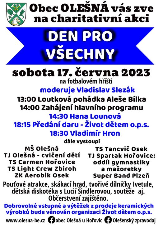 Čas letí jako voda a v současné době už jsou v plném proudu přípravy tradičních červnových Olešenských slavností, aneb Dne pro všechny s charitativním podtextem.