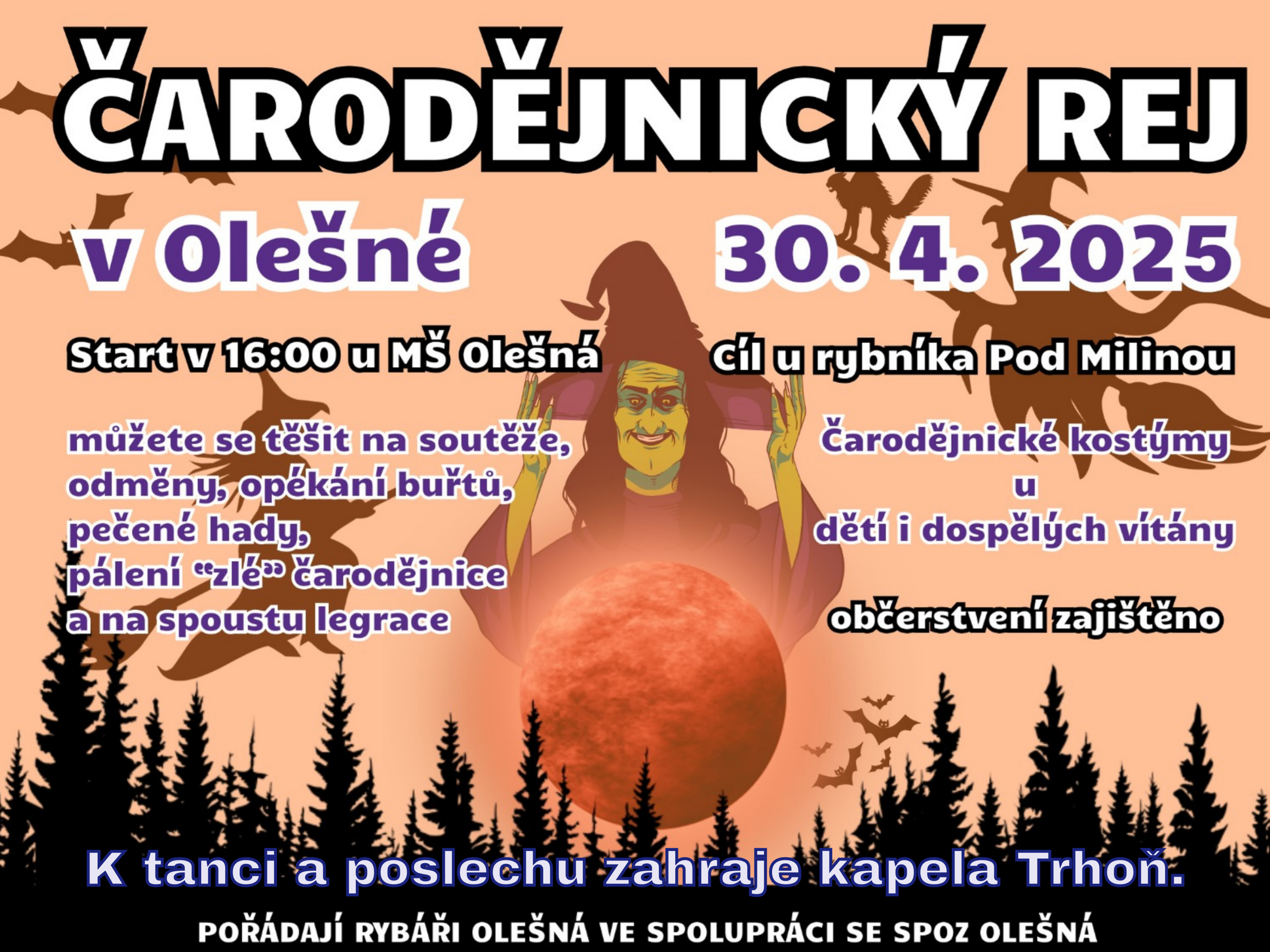 Máme zaručené zprávy, že ve středu 30. dubna se i na olešenské návsi slétnou čarodějky a čarodějnice zblízka i zdaleka, aby si užili svůj sváteční den pořádným čarodějnickým rejem! Vítáni jsou úplně všichni bez rozdílu věku a čarodějnických zkušeností!