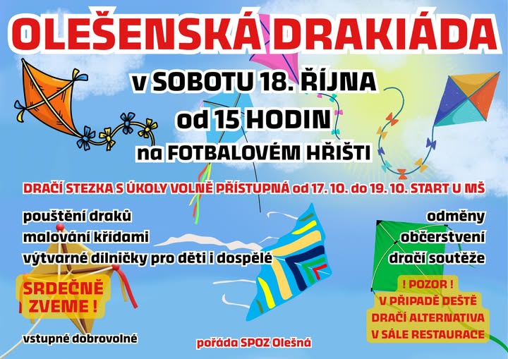 Srdečně zveme všechny malé i velké milovníky draků a létání na tradiční olešenskou drakiádu, tentokrát ve spojení s Dračí stezkou, a to na na sobotu 9. září 2023. Stezka bude připravena už od 10 hodin, vlastní drakiádu odstartujeme v 15 hodin. Těšit se můžete krom pouštění draků také na spoustu soutěží, společné vyrábění draků a vlaštovek, malování křídami a další zábavu. Materiál na výrobu draků bude zajištěn zdarma, vstupné na stezku i na drakiádu je dobrovolné. Celým odpolednem vás provede oblíbený Jirka Sýkora, pro všechny budou připraveny teplé nápoje zdarma. Přijďte, jste srdečně zváni. V případě nepříznivého počasí proběhne drakiáda v sále restaurace, včetně Dračí stezky! Přijďte, jste srdečně zváni. Plakát naleznete zde.