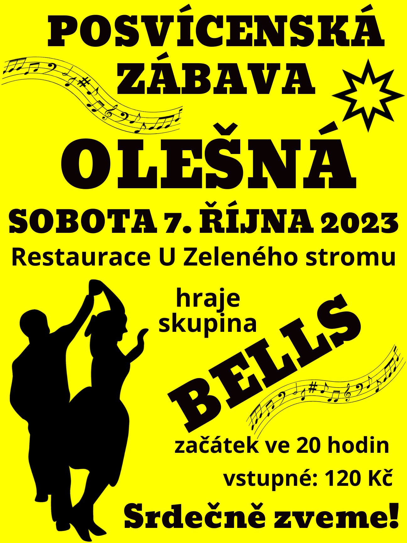 Obec Olešná všechny srdečně zve na Posvícenkou zábavu, která se bude konat v sobotu 7. října od 20 hodin v sále restaurace U zeleného srtomu. Vstupné je 120 Kč, k tanci a poslechu zahraje skupina Bells.