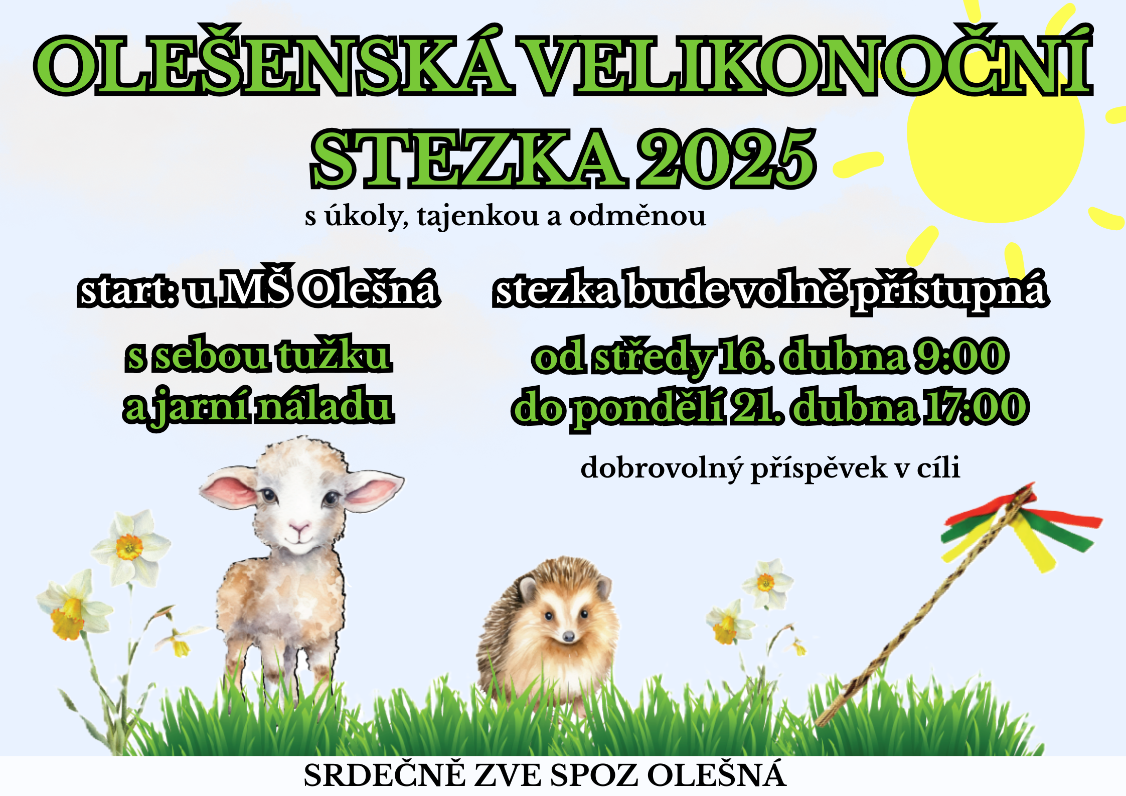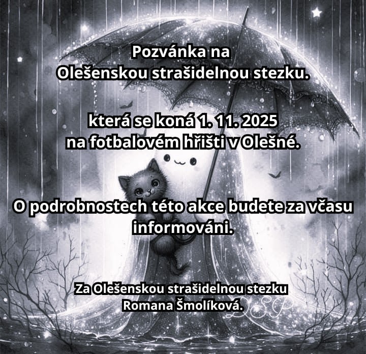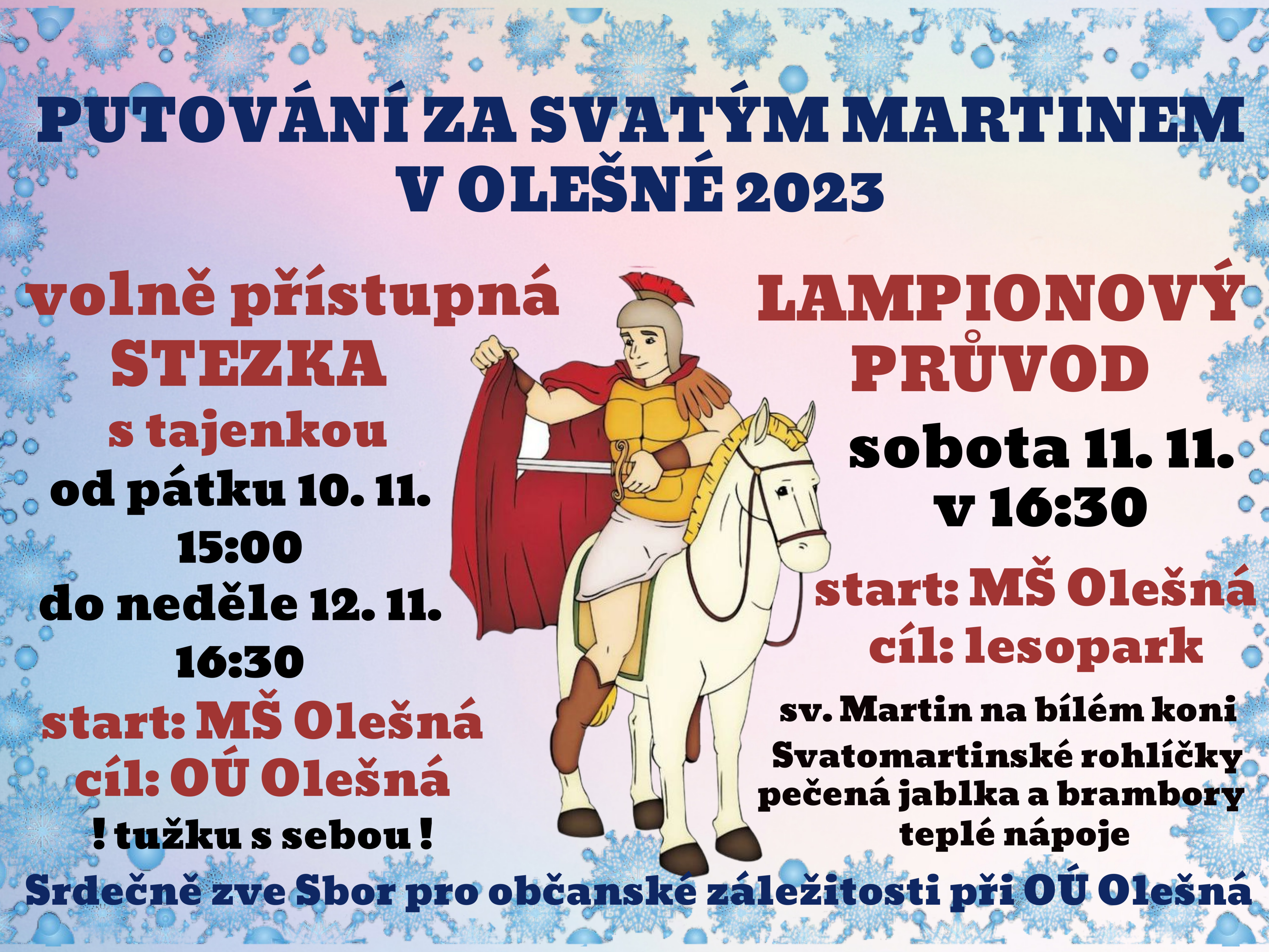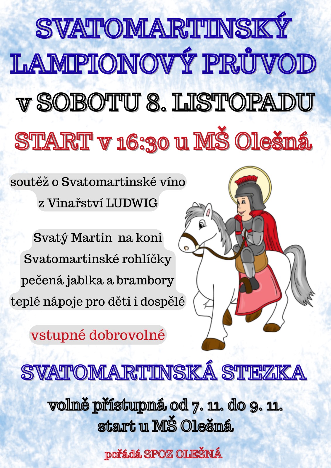 Členky Sboru pro občanské záležitosti v Olešné srdečně zvou malé i velké na tradiční Svatomartinský lampionový průvod, který se uskuteční v sobotu 8.11.2025. Na návsi u MŠ se sejdeme v 16:30 a po krátkém úvodu nás svatý Martin odvede do lesoparku. Tam bude možnost se se svatým Martinem vyfotit, opéci si jablko, pochutnat si na bramborách pečených v popelu a svatomartinských rohlíčcích a zahřát se teplými nápoji nebo si zasoutěžit o některou z 30 lahví Svatomartinského nebo mladého vína, které nám opět věnovalo Vinařství Ludwig. Od pátku 7.11. do neděle 9.11. budou také připraveny dvě varianty Podzimní stezky s úkoly a malou odměnou v cíli. Start bude jako vždy u MŠ Olešná. Více informací naleznete na přiloženém plakátu.