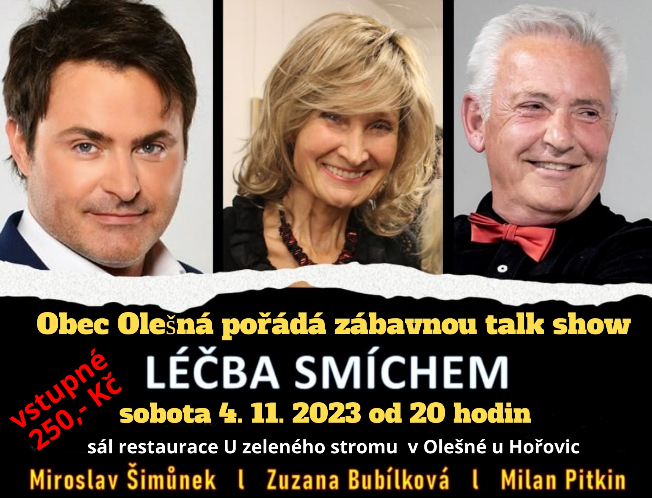 Obec Olešná srdečně zve všechny milovníky humoru na zábavnou talk show Z. Bubílkové, M. Šimůnka a M. Pitkina s názvem Léčba smíchem. Krom mluveného slova se můžete těšit na písně W. Matušky, které zazpívá M. Pitkin. Akce se bude konat v sále restaurace U Zeleného stromu v Olešné v sobotu 4. listopadu od 20 hodin. Cena vstupenek v předprodeji na OÚ Olešná je 200 Kč, vstupné na místě bude 250 Kč.