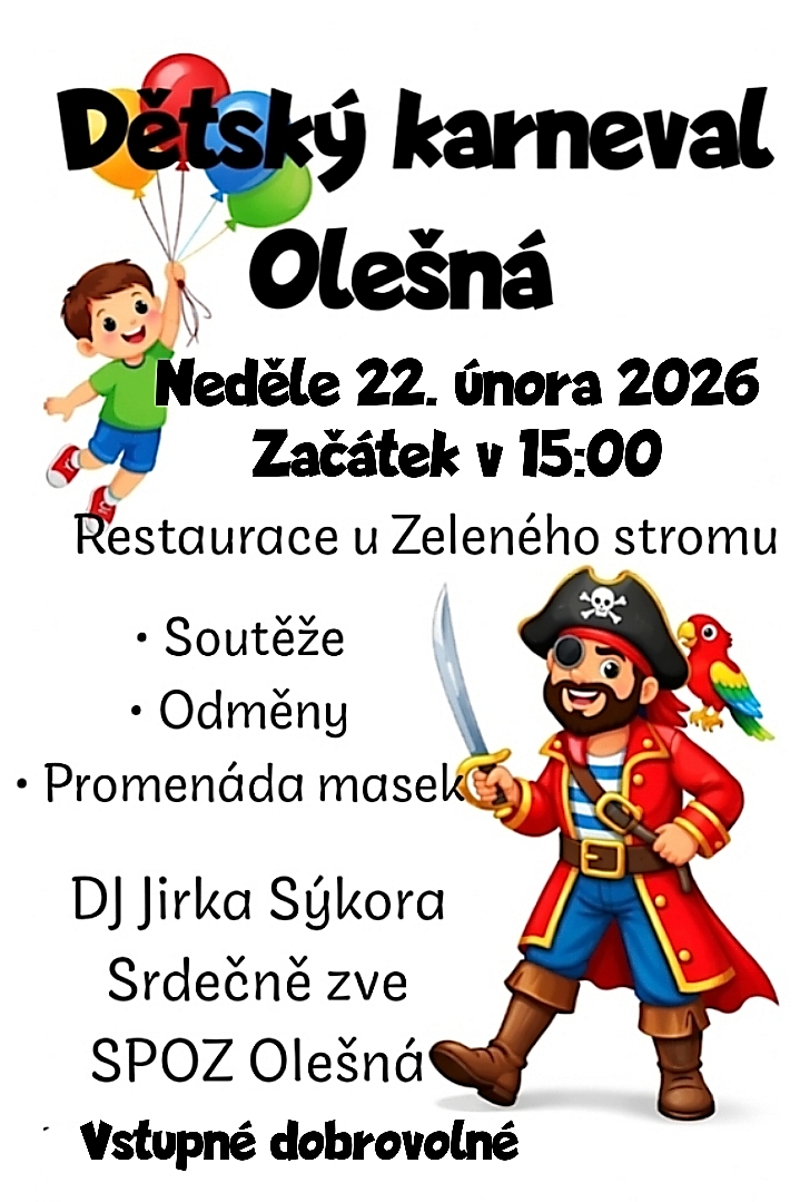Sbor pro občanské záležitosti Olešná srdečně zve děti i jejich doprovod na tradiční Dětský karneval, který se koná v Olešné v sále Restaurace U Zeleného stromu.