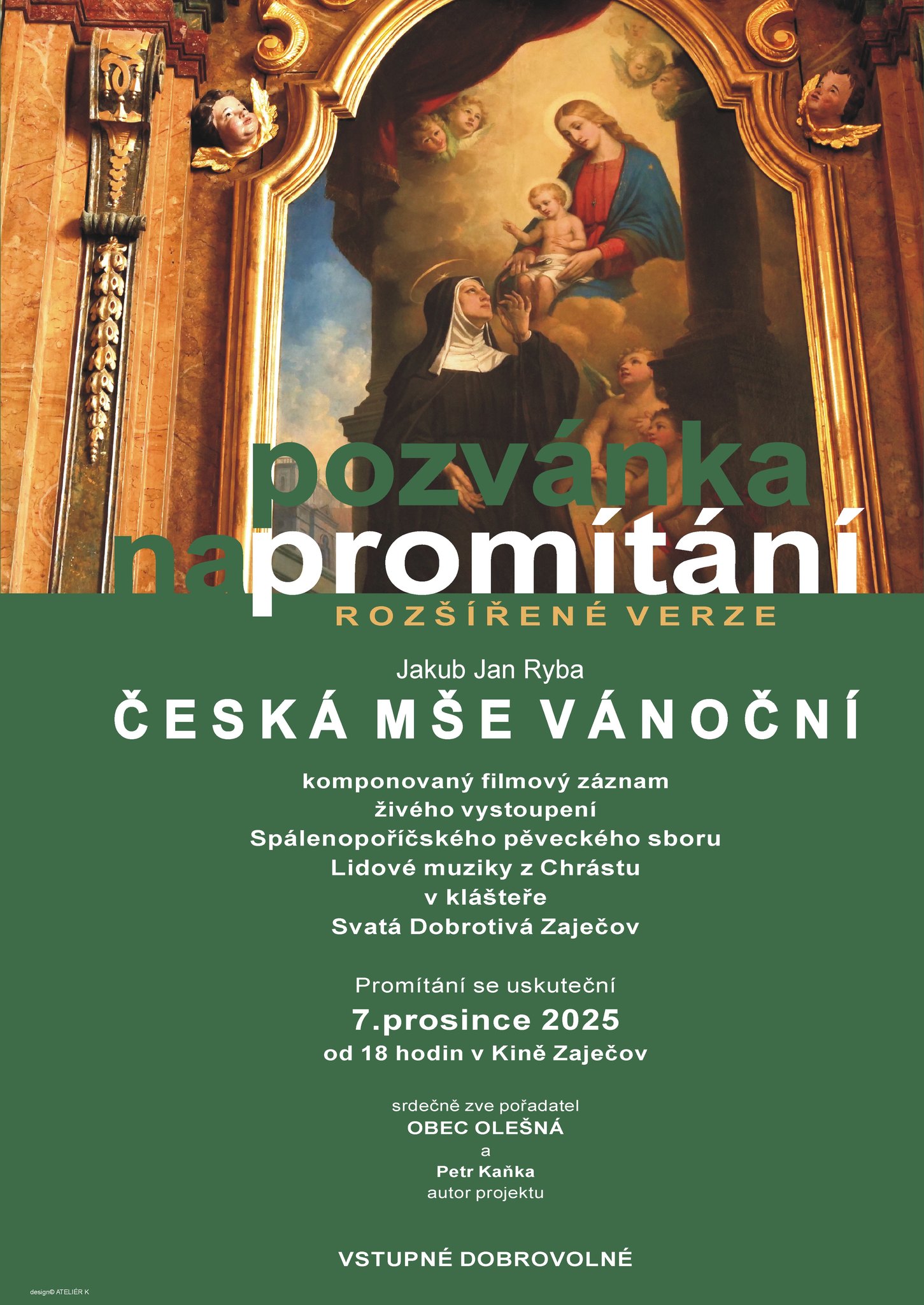Srdečně zveme na promítání živého záznamu České mše vánoční J.J. Ryby, jak ji zachytil ve Svaté Dobrotivé v Zaječově náš olešenský umělecký fotograf, výtvarník a grafik Petr Kaňka. Přijďte si užít "Rybovku" v teple a pohodlí zaječovského kina v neděli 7. prosince od 18 hodin. Promítání je obohaceno ještě o další záběry, chybět nebude ani úvodní slovo autora projektu. Vstupné je dobrovolné. Přijďte se s námi naladit na Vánoce.